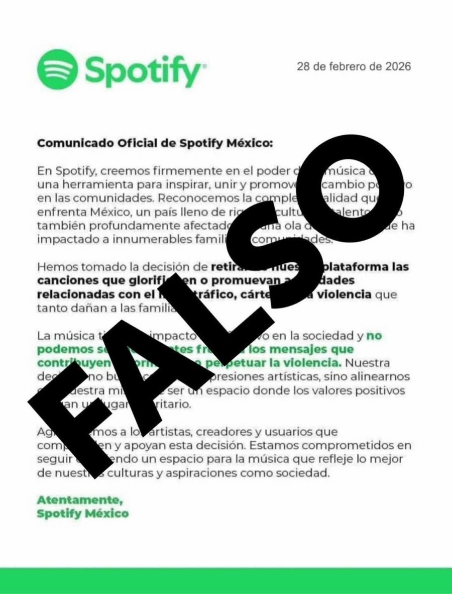 Falso comunicado viral de Spotify México sobre retiro de narcocorridos: muchos medios y comunicadores cayeron en la desinformación