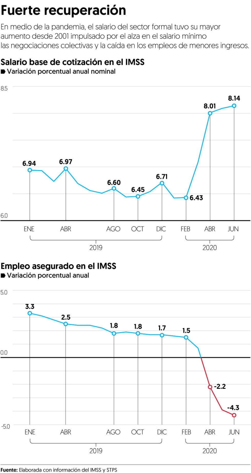 En junio de 2020, el Salario Base de Cotización (SBC) promedio de los trabajadores asegurados aumentó 8.1 por ciento anual nominal, variación que fue igual a la de mayo previo, y representó la mayor alza para cualquier mes desde julio de 2002, de acuerdo con los datos del Instituto Mexicano del Seguro Social (IMSS).