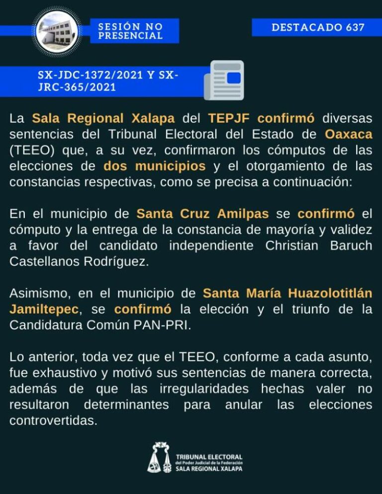 Ratifica Sala Xalapa triunfo de candidato independiente en Santa Cruz Amilpas La Sala Regional Xalapa del Tribunal Electoral del Poder Judicial de la Federación (TEPJF), ratificó el triunfo del candidato independiente,… 11 septiembre, 2021
