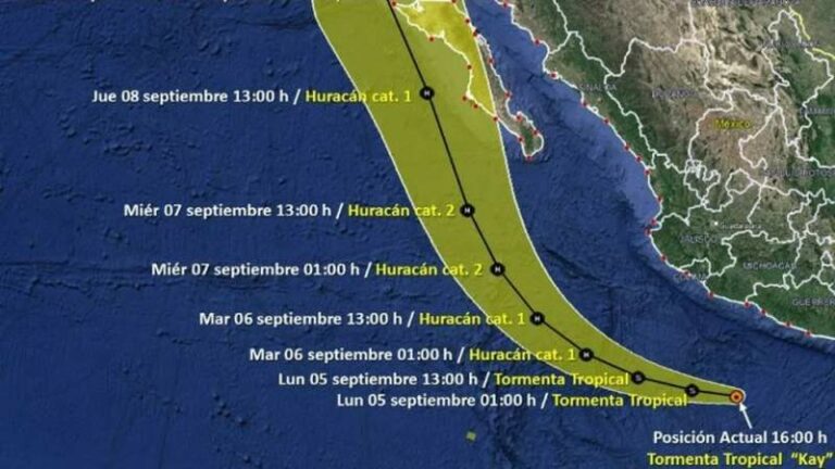 Estados en alerta y trayectoria de la Tormenta Tropical “Kay”: se convertirá en huracán categoría 2 (+150 km/h) De acuerdo con el reporte del clima del Sistema Meteorológico Nacional, este 04 de septiembre al medio día el centro… 4 septiembre, 2022