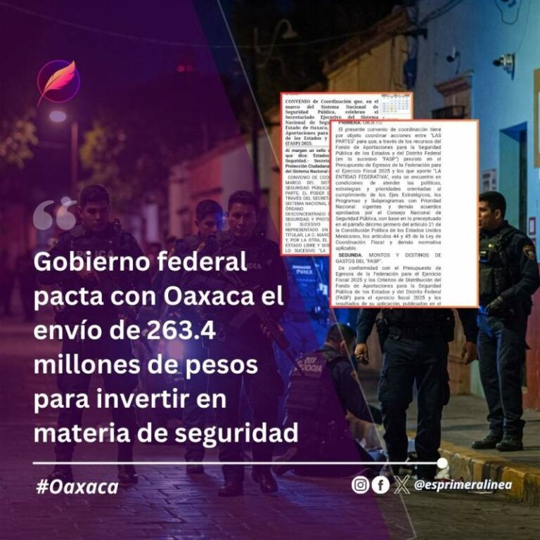Gobierno federal pacta con Oaxaca el envío de 263.4 millones de pesos para invertir en materia de seguridad; autoridades locales deberán aportar otros 105 mdp Gobierno federal pacta con Oaxaca el envío de 263.4 millones de pesos para invertir en materia de seguridad; autoridades locales… 2 mayo, 2025