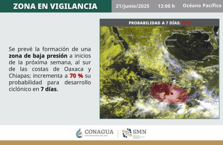 Continúa monitoreo de fenómeno en las costas de Oaxaca; probabilidad ciclónica se eleva a 70 por ciento Continúa monitoreo de fenómeno en las costas de Oaxaca; probabilidad ciclónica se eleva a 70 por ciento 21 junio, 2025