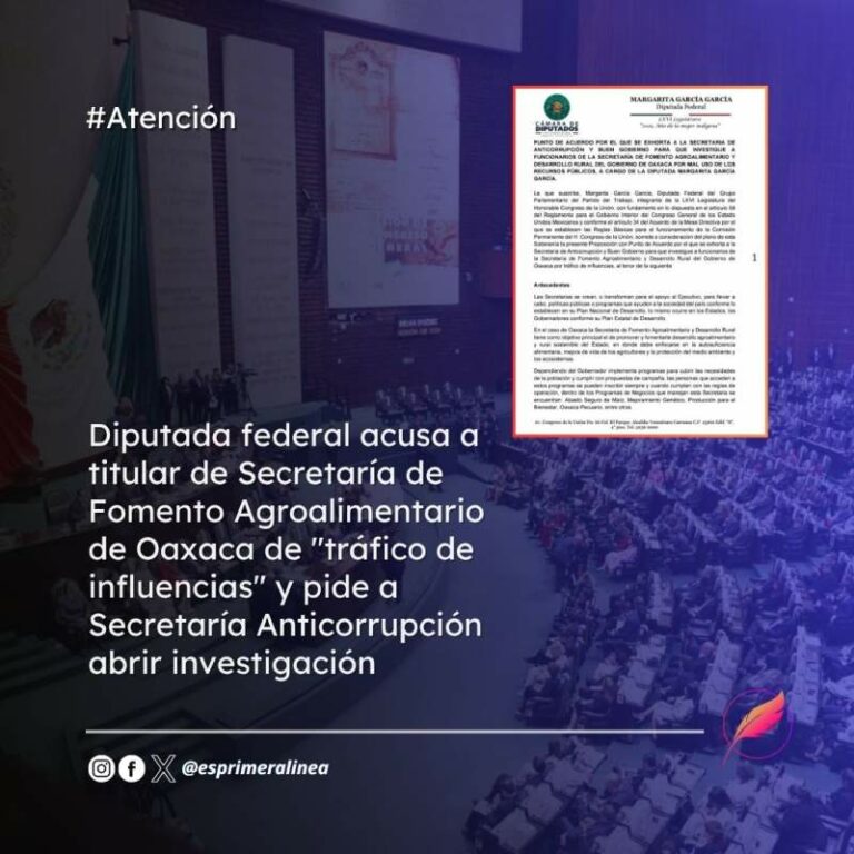 Diputada federal acusa a titular de Secretaría de Fomento Agroalimentario de Oaxaca de “tráfico de influencias” y pide a Secretaría Anticorrupción abrir investigación Diputada federal acusa a titular de Secretaría de Fomento Agroalimentario de Oaxaca de "tráfico de influencias" y pide a Secretaría… 20 junio, 2025