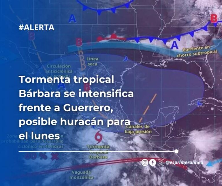 Tormenta tropical Bárbara se intensifica frente a Guerrero, posible huracán para el lunes La tormenta tropical Bárbara, formada esta madrugada frente a Guerrero, se fortalece con vientos de 95 km/h, con riesgo de… 8 junio, 2025