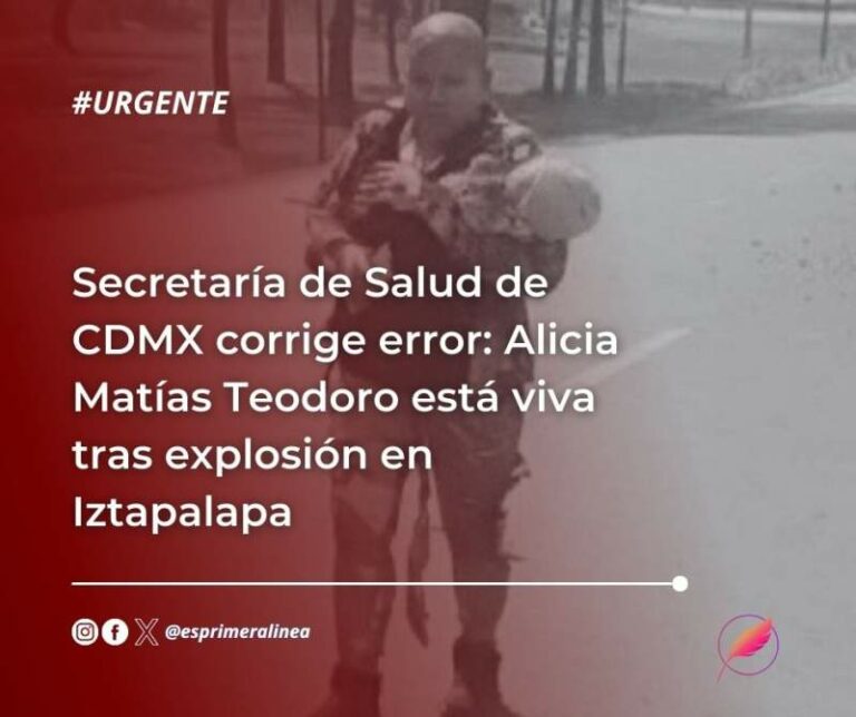 Secretaría de Salud de CDMX corrige error: Alicia Matías Teodoro está viva tras explosión en Iztapalapa La Secretaría de Salud Pública de la Ciudad de México emitió un comunicado corrigiendo información errónea sobre el fallecimiento de… 12 septiembre, 2025