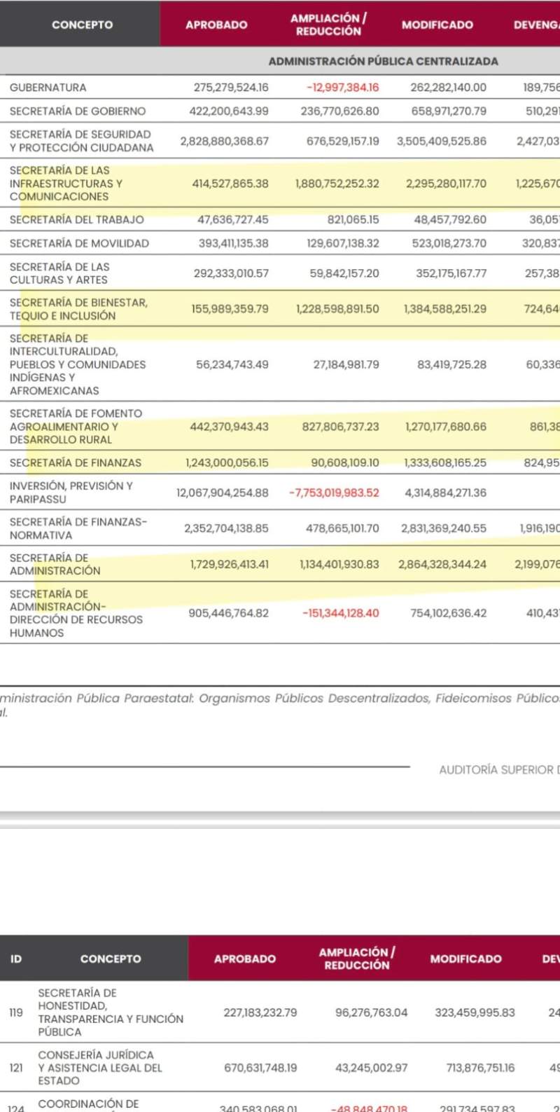 Asimismo, la Secretaría de Bienestar, Tequio e Inclusión, que durante 9 meses obtuvo incrementos de mil 228 millones de pesos; la Secretaría de Administración, con mil 313 millones de pesos y Caminos Bienestar, con mil 48 millones de pesos.