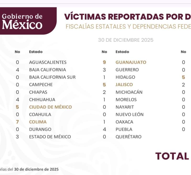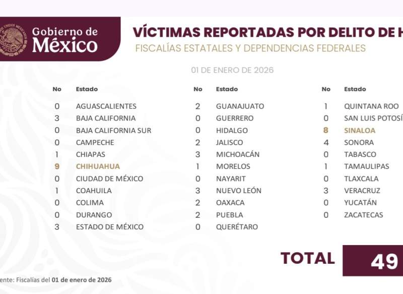 Mientras tanto, en tres entidades se registraron tres víctimas durante las primeras 24 horas del año: Guanajuato, Jalisco, Morelos, y en cuatro más, incluida Oaxaca, se registraron dos víctimas de asesinatos (Colima, Puebla, Sinaloa y Oaxaca).