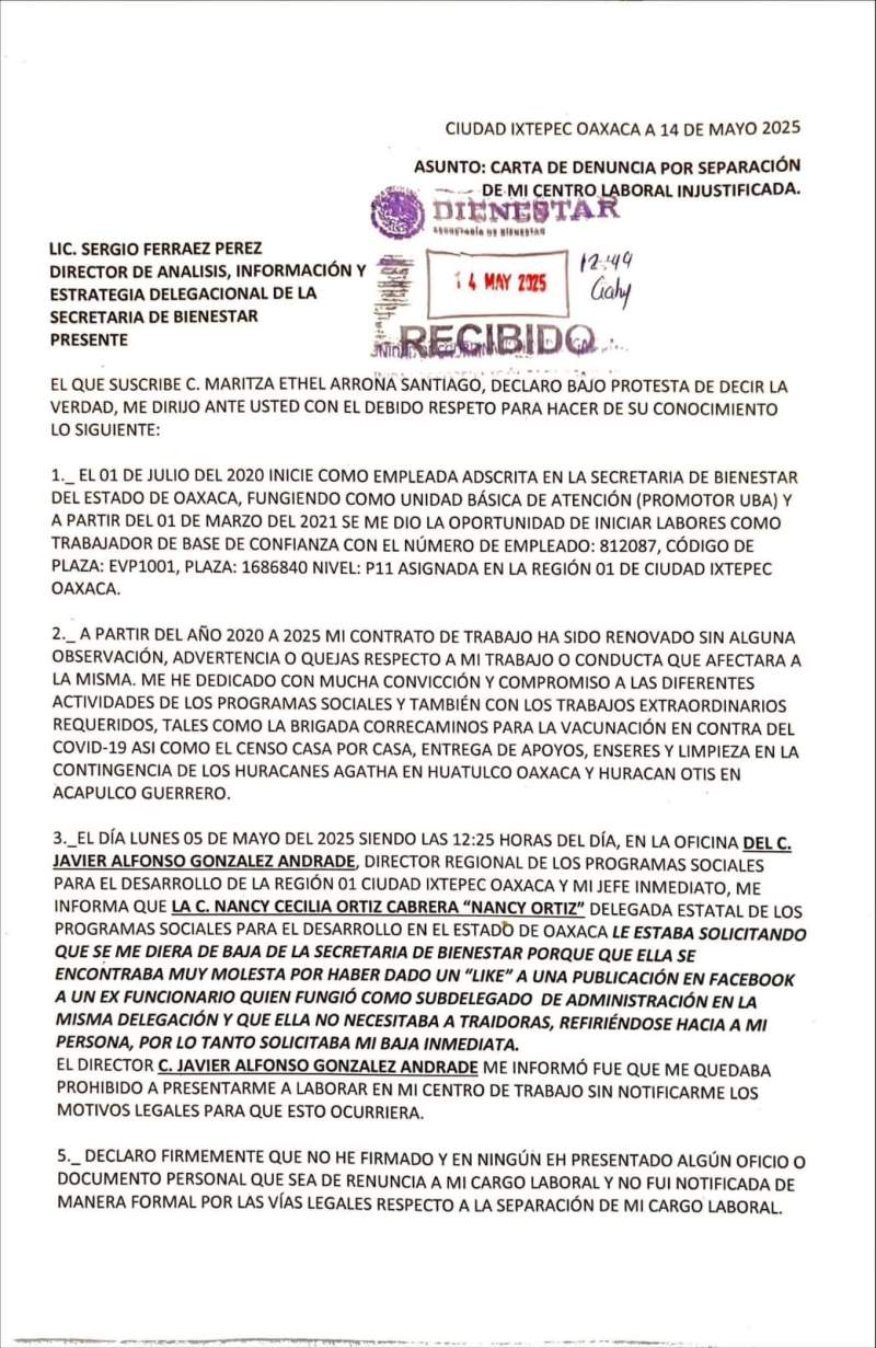 La delegación de la Secretaría de Bienestar en el estado de Oaxaca que encabeza, Nancy Ortíz Cabrera, enfrenta acusaciones de autoritarismo y violencia institucional tras la denuncia pública de Ethel Arrona, ex-servidora de la nación en Ciudad Ixtepec.