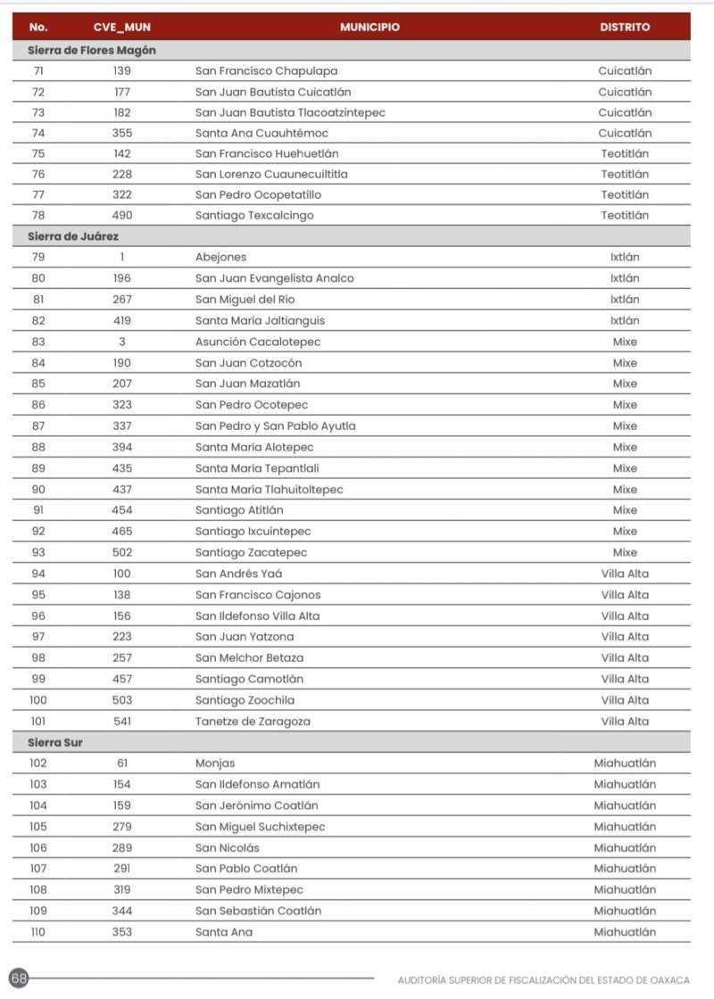 En el caso de la región de la Mixteca los ayuntamientos sin proyectos reportados fueron Juxtlahuaca, Tamazulápam del Progreso, Tlaxiaco y Santa María Apazco. En el caso de la Cañada, algunas de las demarcaciones involucradas en las observaciones son Cuicatlán, Santiago Texcalcingo, San Juan Bautista Tlacoatzintepec y San Francisco Chapulapa, mientras que por la Sierra Sur Villa Putla de Guerrero, San Jerónimo Coatlán, San Pablo Coatlán, San Sebastián Coatlán y San Carlos Yautepec.
