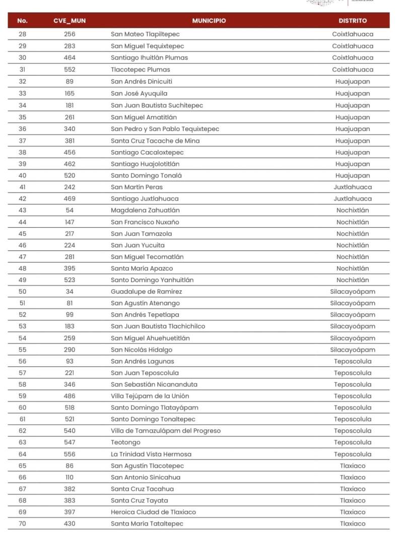 Por la región del Istmo Asunción Ixtaltepec, El Espinal, San Dionisio del Mar y Santo Domingo Petapa, mientras que por la Costa Santiago Jamiltepec, San Mateo Piñas, San Juan Bautista lo de Soto y Santos Reyes Nopala, entre otros.