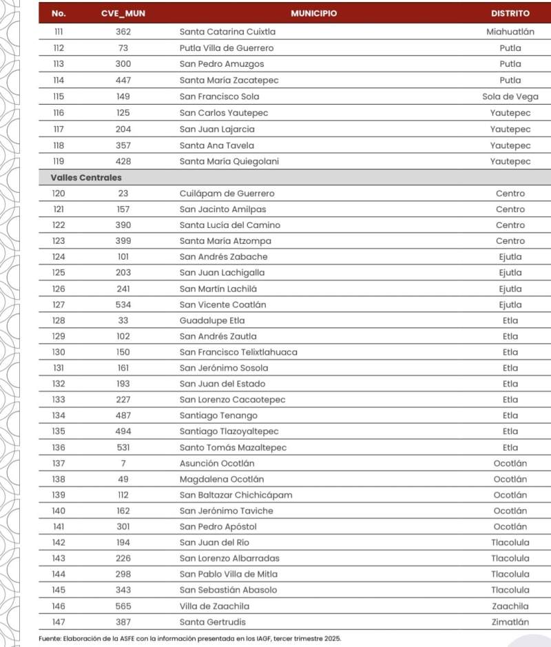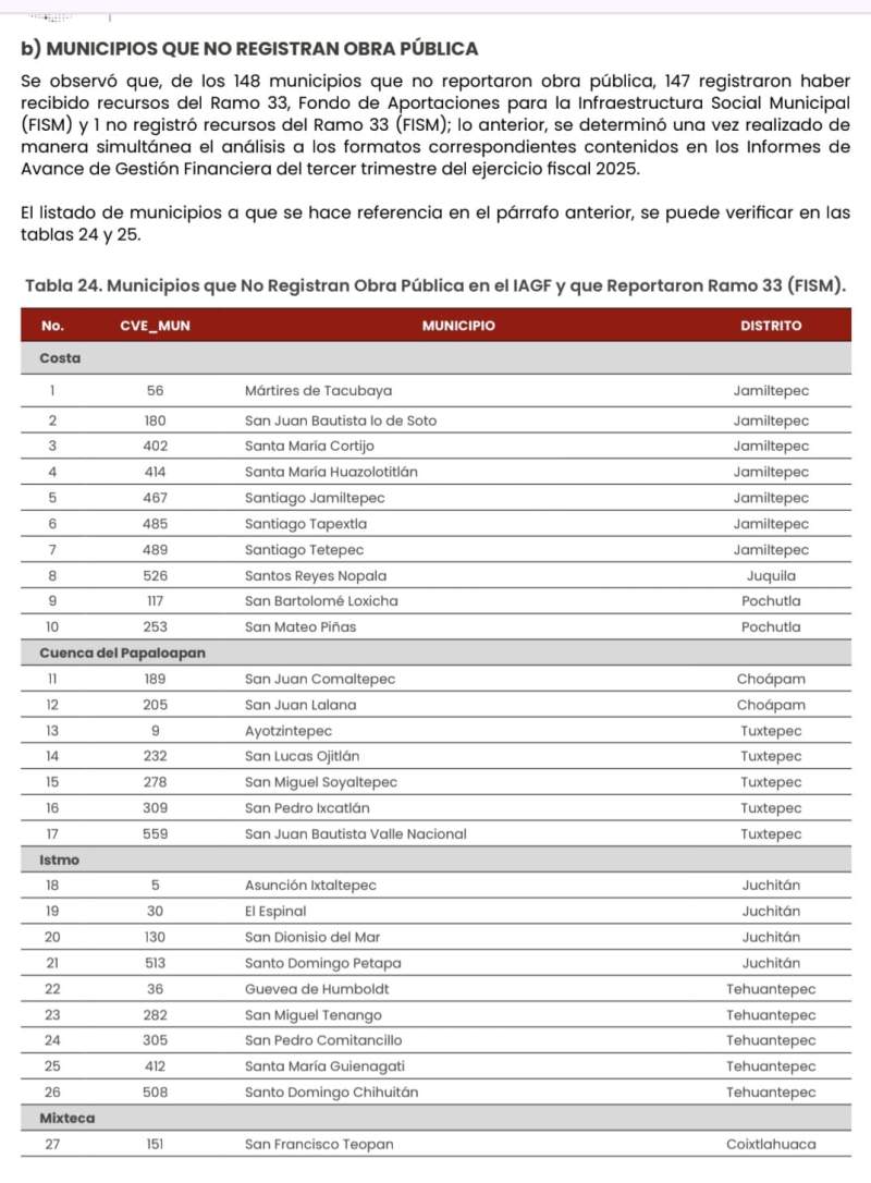 “Se observó que, de los 148 municipios que no reportaron obra pública, 147 registraron haber recibido recursos del Ramo 33, Fondo de Aportaciones para la Infraestructura Social Municipal (FISM) y uno (Santa María Zoquitlán) no registró recursos del Ramo 33 (FISM). Lo anterior, se determinó una vez realizado de manera simultánea el análisis a los formatos correspondientes contenidos en los Informes de Avance de Gestión Financiera del tercer trimestre del ejercicio fiscal 2025”, precisó.
