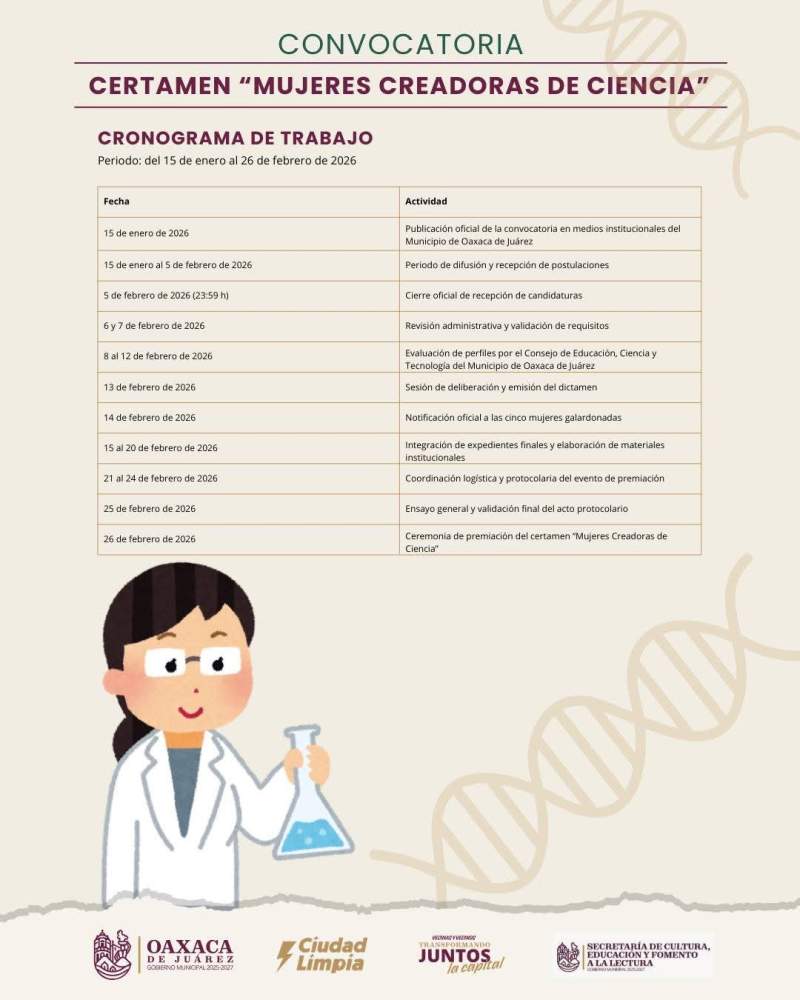 La convocatoria es impulsada a través de la Secretaría de Cultura, Educación y Fomento a la Lectura, en coordinación con el Consejo de Educación, Ciencia y Tecnología del Municipio de Oaxaca de Juárez, y está dirigida a mujeres mexicanas con trayectoria científica comprobable, prioritariamente originarias o con impacto directo en el municipio.