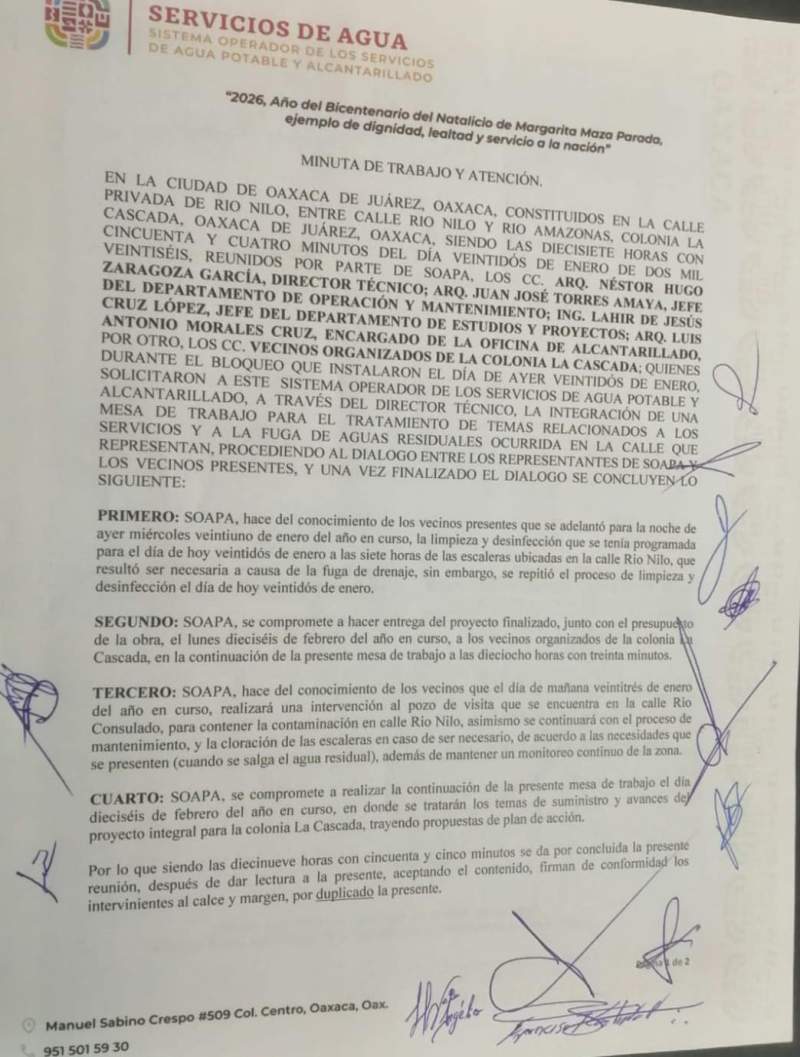 Tras una serie de protestas realizadas el miércoles pasado, funcionarios de Soapa se comprometieron con vecinos de la colonia La Cascada a entregar, el próximo 16 de febrero, el proyecto de rehabilitación de la red de drenaje de la calle Río Nilo, que durante un año y medio ha permanecido colapsado, con una constante fuga de aguas negras.