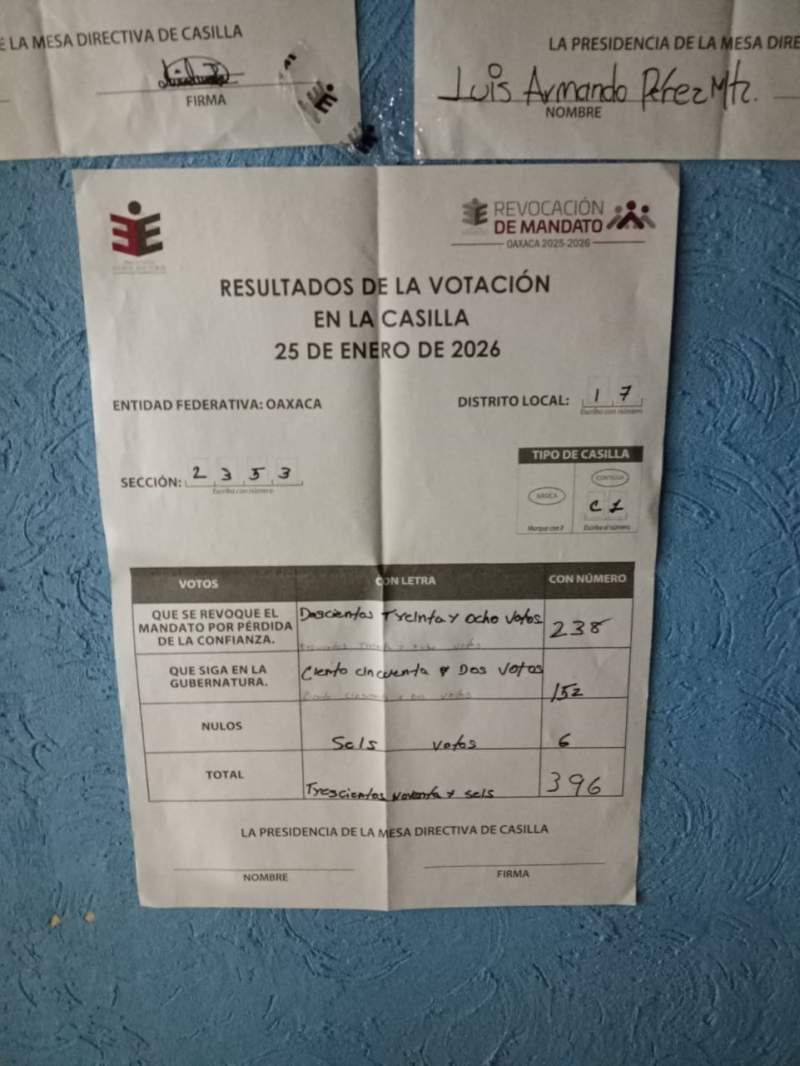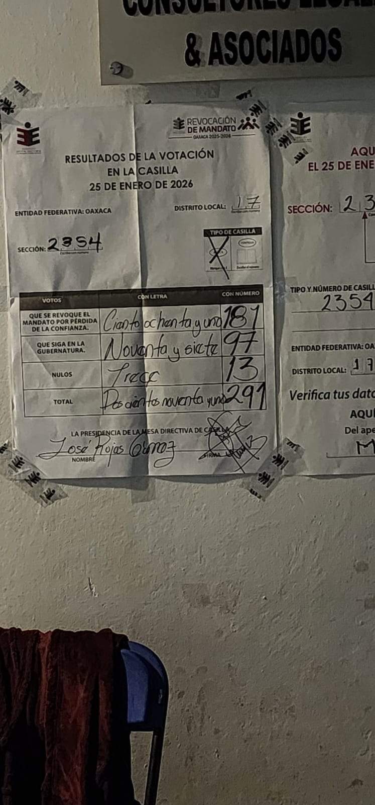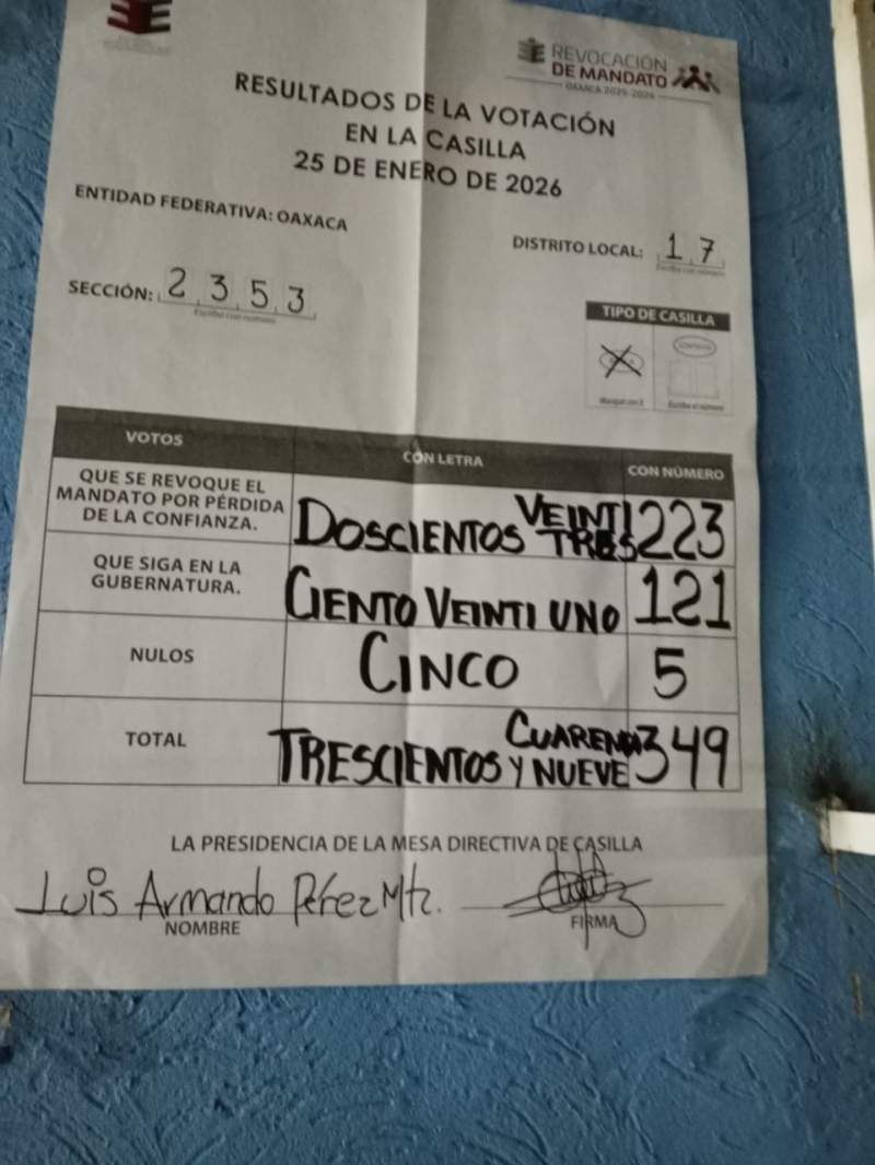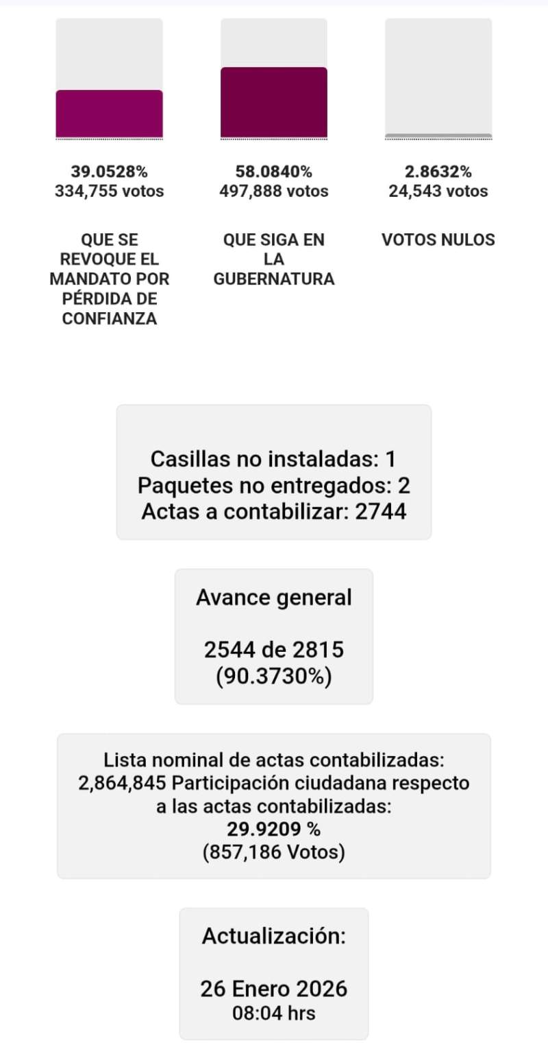 Entre acusaciones de acarreo y compra de votos, y de acuerdo con el último corte de información emitido por el Instituto Estatal Electoral y de Participación Ciudadana de Oaxaca (IEEPCO) a las 8 de la mañana con 4 minutos, el 58.08% de los participantes en la consulta de revocación de mandato se manifestaron a favor de la continuidad de Salomón Jara como gobernador.