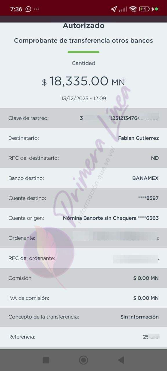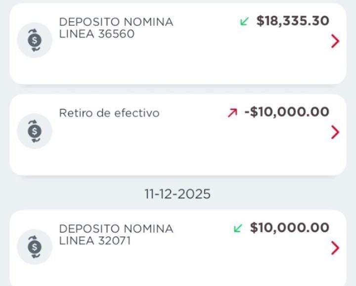 También nos proporcionó copias de depósitos en cajeros de algunas devoluciones de dinero a terceros que Edith Santibañez determinara, como una del 13 de diciembre de 2025 por la cantidad de $18,335.00 a Fabián Gutiérrez, quien presuntamente es uno de los choferes de la secretaria del Trabajo. Otros movimientos más por $5,000.00 y uno más de $10,000.00 del 16 de diciembre del 2025.