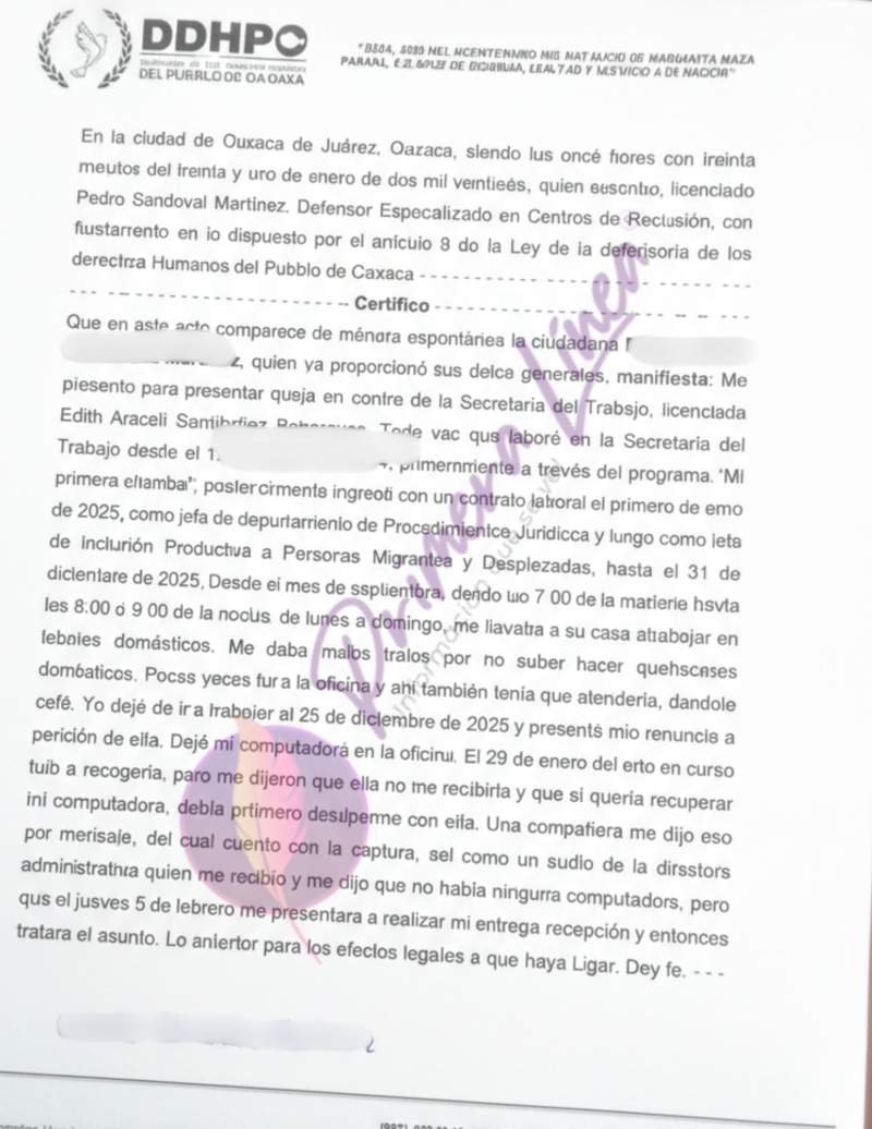 Así con esas expresiones de odio, desprecio y humillación, la titular de la Secretaría del Trabajo de Oaxaca, Edith Aracely Santibañez Bohórquez maltrata a las y los empleados de esa institución que contrario a sus funciones y responsabilidades de velar por el bienestar laboral de sus subordinados, hace lo contrario.