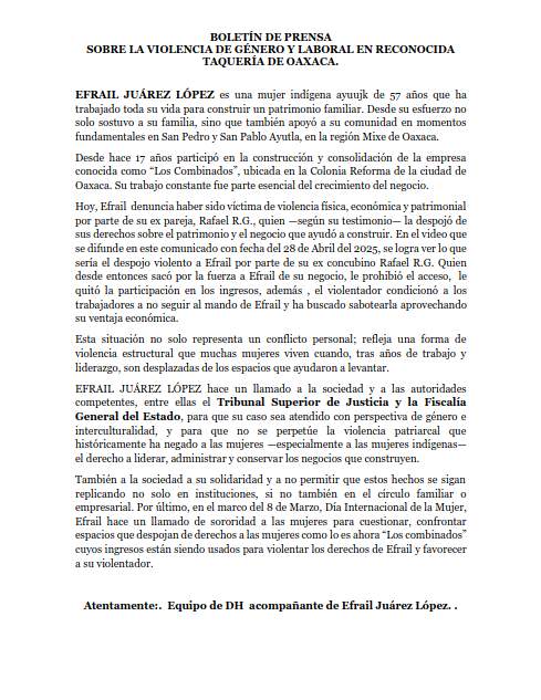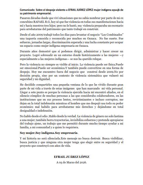 La mujer indígena Efrail Juárez López denunció este día haber sido víctima de violencia de género y presuntamente haber sido despojada del establecimiento comercial denominado Los Combinados, una taquería reconocida en la zona metropolitana de Oaxaca de Juárez.