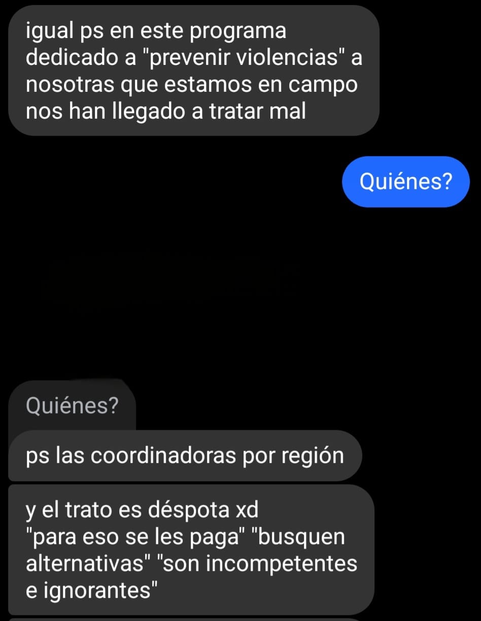 Aunado a esta situación, se expone que, mientras el personal de Centro LIBRE recorre las comunidades para brindar asesoría jurídica y prevención de violencia, ellas mismas son víctimas de violencia laboral por parte de las coordinadoras regionales.