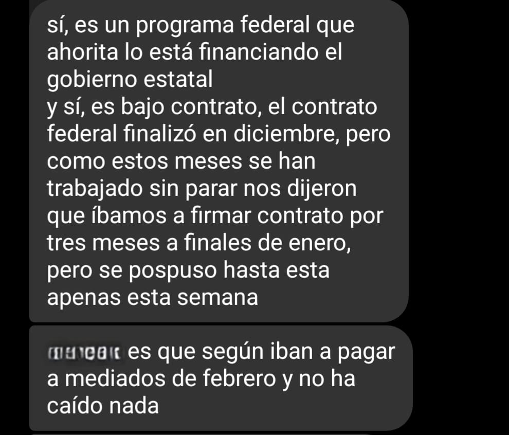La crisis financiera que atraviesan estas trabajadoras es resultado de una cadena de omisiones administrativas. Tras el finalizar su contrato en diciembre, el cual absorbió el gobierno federal porque así fue el esquema al tratarse de un programa nacional, la administración de Salomón Jara les pidió continuar con las labores, pero ahora el pago sería bajo su responsabilidad.