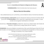 “Hacemos un llamado enérgico a Salomón Jara Cruz, gobernador del Estado de Oaxaca, a garantizar la seguridad de las mujeres. Exigimos a las autoridades competentes, Bernardo Rodríguez Alamilla, Fiscal del Estado, la investigación pronta con perspectiva de género e intercultural y castigo inmediato a los responsables”