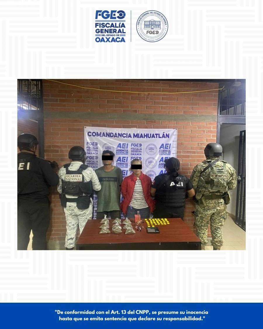 Estas acciones judiciales fueron encabezadas por la FGEO, a través de la Vicefiscalía Regional de Valles Centrales y la Agencia Estatal de Investigaciones (AEI), en coordinación con la Secretaría de la Defensa Nacional (DEFENSA) y la Guardia Nacional (GN), en tres inmuebles ubicados en el municipio de Miahuatlán de Porfirio Díaz, como parte de investigaciones por delitos contra la salud en su modalidad de narcomenudeo en su hipótesis de comercio de metanfetamina y cannabis sativa.