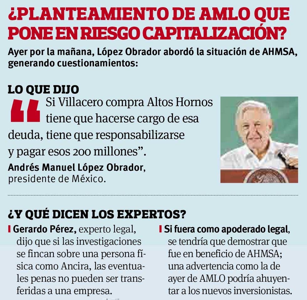 “Queremos recuperar esos 200 millones de dólares. Si Villacero compra Altos Hornos tiene que hacerse cargo de esa deuda, tiene que responsabilizarse y pagar esos 200 millones. Lo que hemos dicho, porque ha habido consulta de la Fiscalía, es que nosotros podríamos dar plazos para el pago de esa deuda, pero no cancelarla”, dijo López Obrador en su conferencia de prensa matutina de ayer.