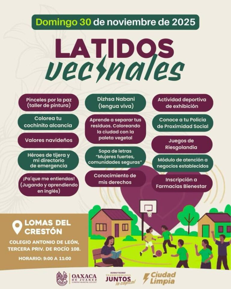 Oaxaca de Juárez invita a una nueva jornada de actividades de Latidos Vecinales del 27 al 30 de noviembre Habrá talleres, dinámicas educativas y espacios de convivencia a cinco colonias y agencias de la capital 27 noviembre, 2025