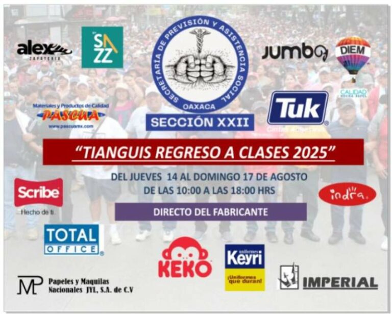 Sección 22 realizará Tianguis Popular para el Regreso a Clases Con el regreso a clases a la vuelta de la esquina, muchas familias oaxaqueñas enfrentan un fuerte gasto para equipar… 8 agosto, 2025