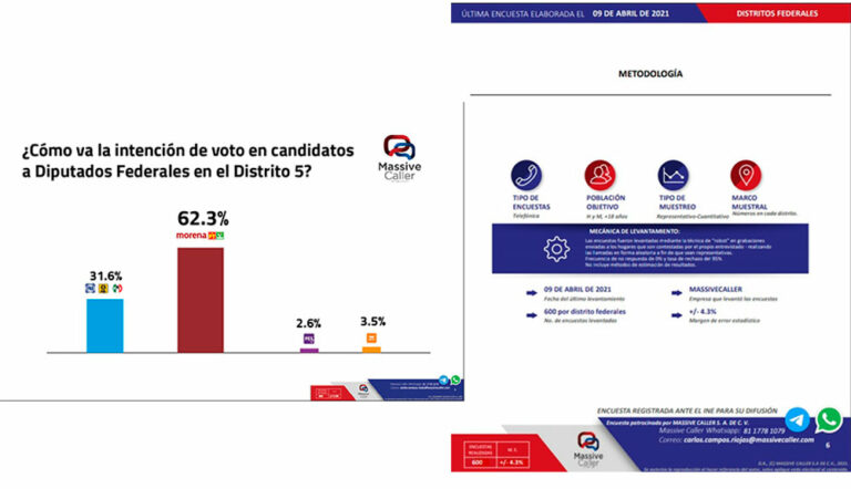 Aventaja Morena y Carol Altamirano distrito 5, confirma encuestadora Massive Caller La prestigiada encuestadora “Massive Caller” dio a conocer que el candidato a la diputación federal por MORENA en el Distrito… 18 abril, 2021