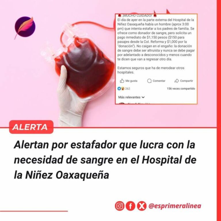 Alertan por estafador que lucra con la necesidad de sangre en el Hospital de la Niñez Oaxaqueña Las organizaciones Staff de los Sueños Oaxaca y Con Causa denunciaron la presencia de un estafador que opera a las… 8 febrero, 2026