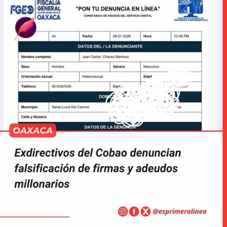 Exdirectivos del Cobao denuncian falsificación de firmas y adeudos millonarios Una grave crisis institucional sacude al Colegio de Bachilleres del Estado de Oaxaca (Cobao), luego de que exdirectivos denunciaran penalmente… 9 febrero, 2026