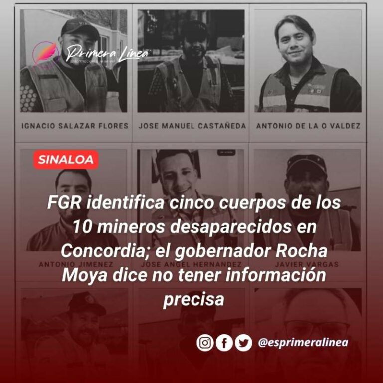 FGR identifica cinco cuerpos de los 10 mineros desaparecidos en Concordia, Sinaloa; gobernador Rocha dice no tener información precisa La FGR confirmó la identificación de cinco cuerpos de los 10 mineros secuestrados el 23 de enero en Concordia, Sinaloa,… 9 febrero, 2026