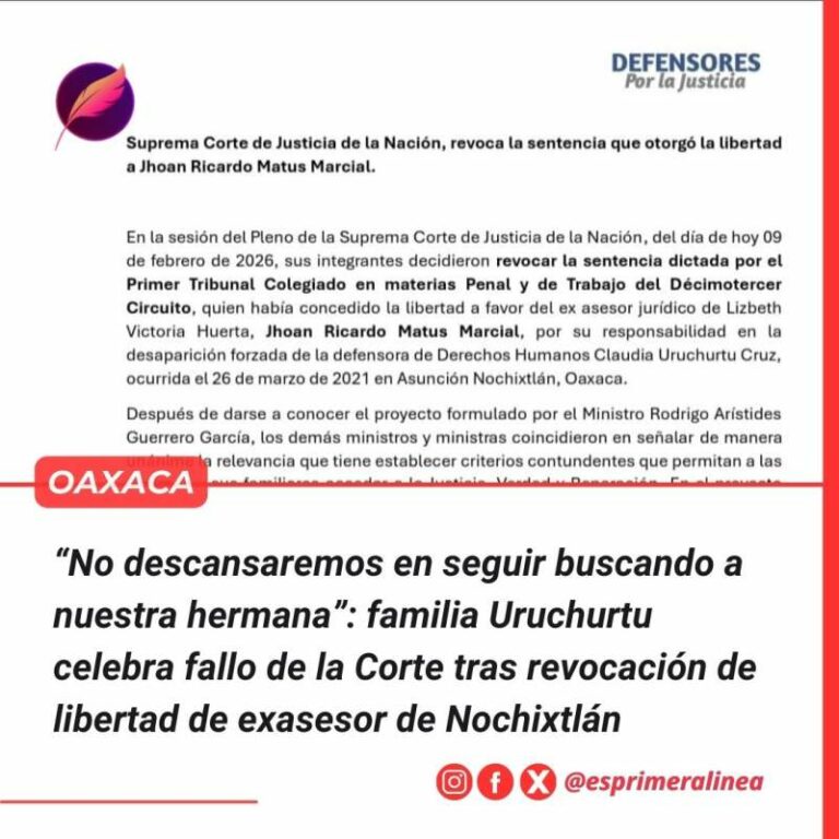 “No descansaremos en seguir buscando a nuestra hermana”: familia Uruchurtu celebra fallo de la Corte tras revocación de libertad de exasesor de Nochixtlán La familia de la activista Claudia Uruchurtu calificó como un avance decisivo hacia la justicia la resolución de la Suprema… 10 febrero, 2026