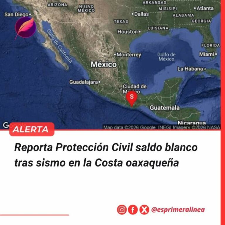 Reporta Protección Civil saldo blanco tras sismo en la Costa oaxaqueña La Coordinación Estatal de Protección Civil de Oaxaca confirmó saldo blanco tras el sismo de magnitud 5.7 registrado la tarde… 8 febrero, 2026