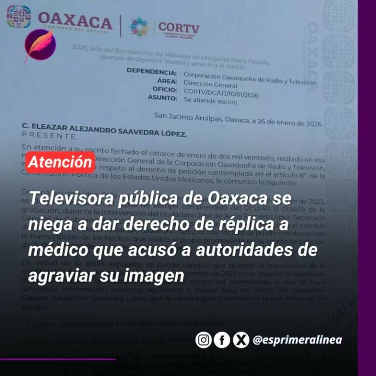 Televisora pública de Oaxaca se niega a dar derecho de réplica a médico que acusó a autoridades de agraviar su imagen La Corporación Oaxaqueña de Radio y Televisión (Cortv) negó el derecho de réplica al médico Alejandro Saavedra, quien denunció que… 9 febrero, 2026