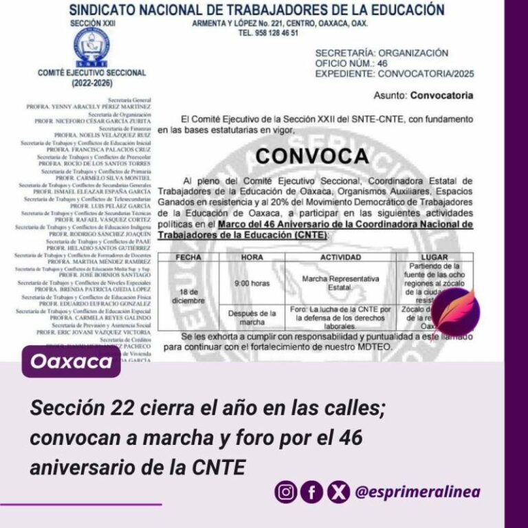 La Sección 22 del SNTE concluirá el año 2025 con una jornada de movilizaciones en la capital oaxaqueña para conmemorar…