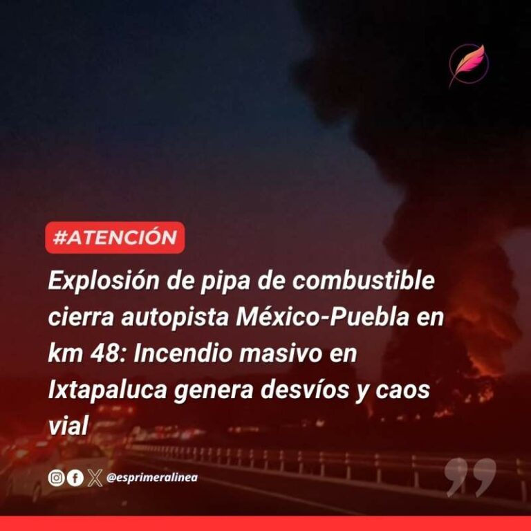 Explosión de pipa de combustible cierra autopista México-Puebla en km 48: Incendio masivo en Ixtapaluca genera desvíos y caos vial Una pipa de combustible volcó y explotó esta tarde en el kilómetro 48 de la autopista México-Puebla, a la altura… 8 noviembre, 2025
