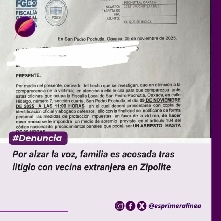 Por alzar la voz, familia es acosada tras litigio con vecina extranjera en Zipolite Una familia con 18 años de residencia en Zipolite denuncia acoso y citatorios por parte de la Marina y la… 9 noviembre, 2025