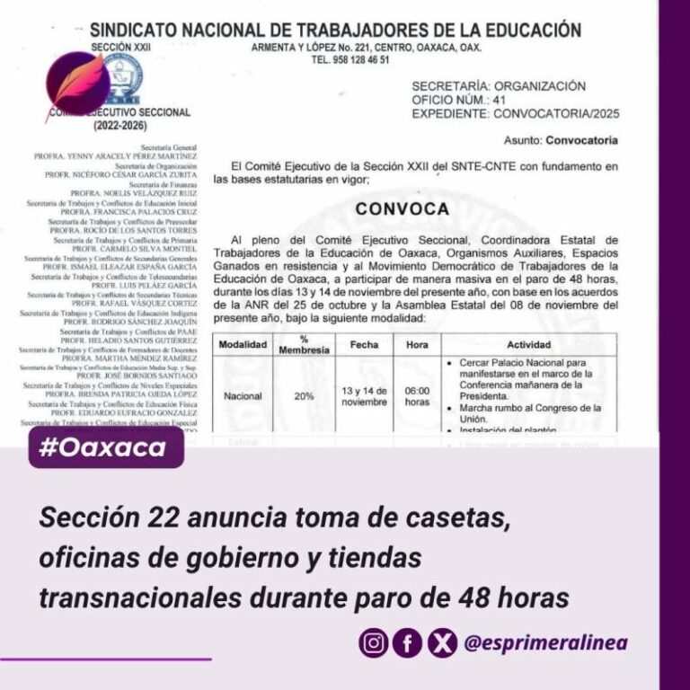 Sección 22 anuncia toma de casetas, oficinas de gobierno y tiendas transnacionales durante paro de 48 horas La Sección 22 de la CNTE convocó a un paro de 48 horas los próximos 13 y 14 de noviembre… 10 noviembre, 2025