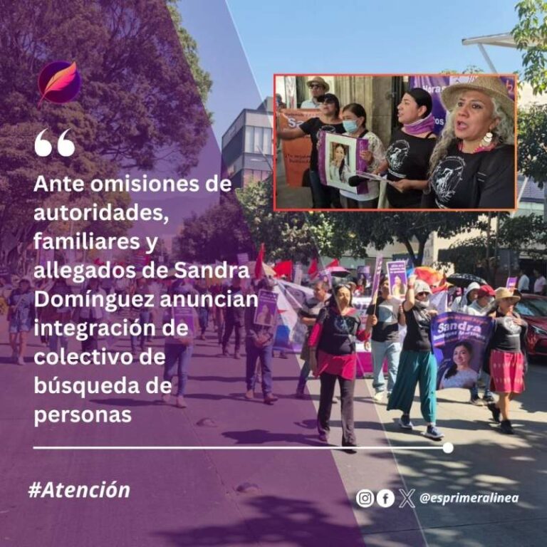 Ante omisiones de autoridades, familiares y allegados de Sandra Domínguez anuncian integración de colectivo de búsqueda de personas La familia de la activista Sandra Domínguez convocó a víctimas indirectas a participar en la creación de un colectivo que… 4 marzo, 2025
