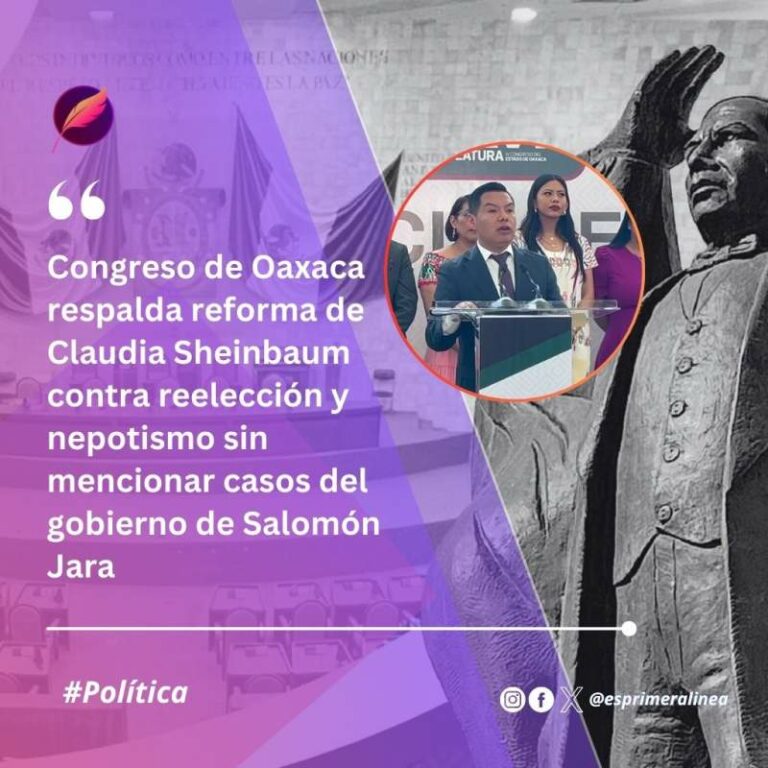 Congreso de Oaxaca respalda reforma de Claudia Sheinbaum contra reelección y nepotismo sin mencionar casos del gobierno de Salomón Jara El Congreso de Oaxaca respaldó la propuesta de Claudia Sheinbaum para evitar la reelección en cargos de elección popular. Sin… 4 marzo, 2025