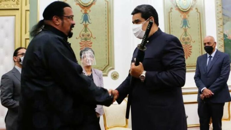 Nicolás Maduro empuña una espada samurái que le regaló el actor Steven Seagal (video) El mandatario desenfundó la espada con ayuda de Seagal e inmediatamente comenzó a maniobrarla, para luego extender un abrazo al… 5 mayo, 2021