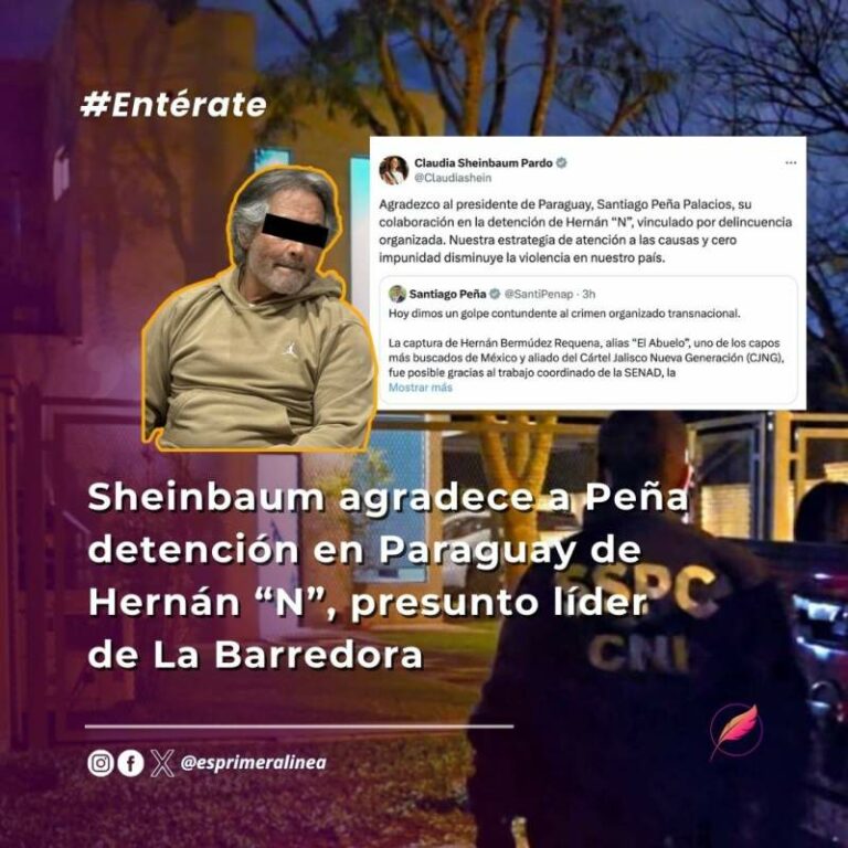 Sheinbaum agradece a Peña detención en Paraguay de Hernán “N”, presunto líder de La Barredora la presidenta Claudia Sheinbaum agradeció al presidente de Paraguay, Santiago Peña, la colaboración en la captura de Hernán Bermúdez Requena,… 13 septiembre, 2025