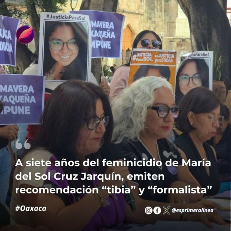 A siete años del feminicidio de María del Sol Cruz Jarquín, emiten recomendación “tibia” y “formalista” La DDHPO emitió la Recomendación 19/2025 sobre el caso de María del Sol Cruz Jarquín, asesinada en 2018. Familiares y… 15 octubre, 2025