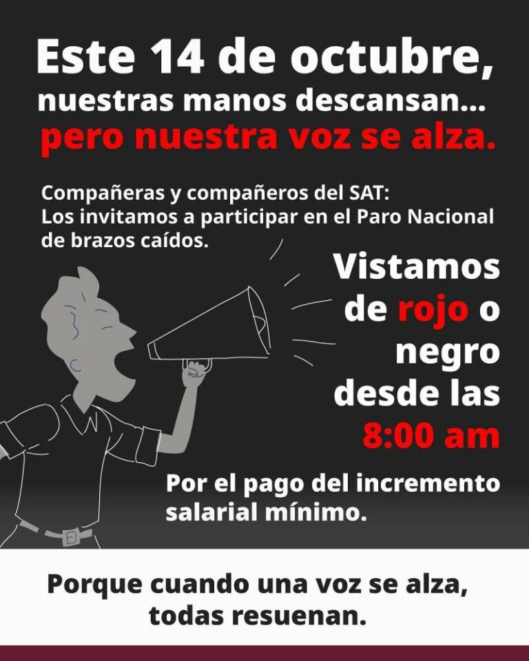 Personal del SAT convoca a “protesta de brazos caídos” por retraso en aumento salarial 2025 y preocupación por anuncio presidencial Trabajadoras y trabajadores del SAT realizarán una protesta pacífica de brazos caídos el martes 14 de octubre de 2025 por… 12 octubre, 2025