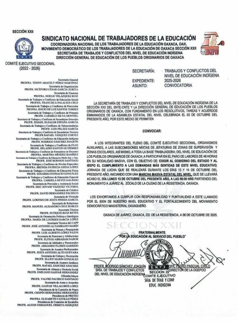 Educación Indígena de la Sección 22 anuncia paro de labores de 48 horas y megamarcha La medida de protesta, acordada en la Asamblea Estatal del 3 de octubre, tiene como principal objetivo exigir al Gobierno… 7 octubre, 2025