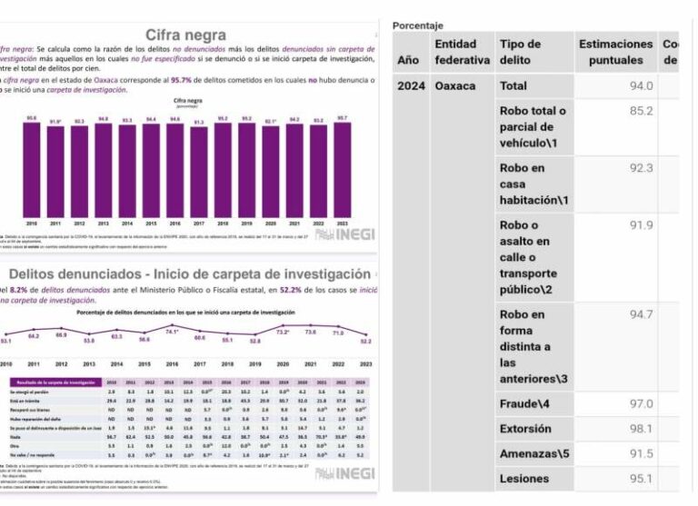 En Oaxaca, el 94 por ciento de los delitos no son investigados o no son denunciados, reporta el Inegi El Instituto precisó que el delito que menos se denuncia en Oaxaca es la extorsión, con una cifra negra de… 10 octubre, 2025