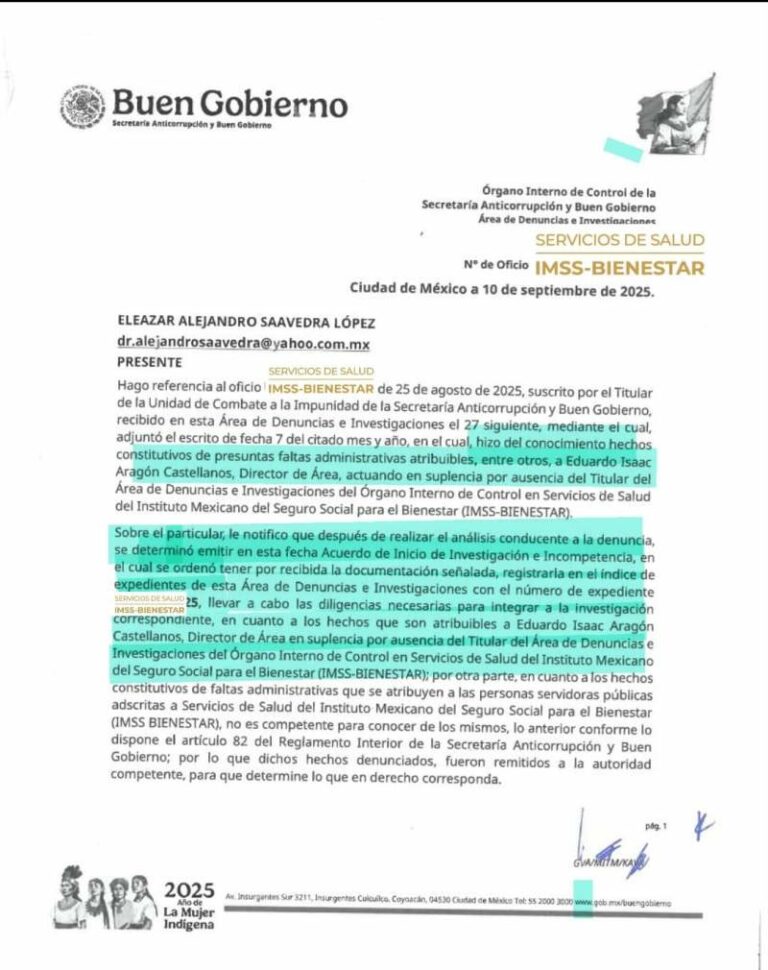 Gobierno federal abre investigación vs funcionario de IMSS Bienestar en Oaxaca, acusado de bloquear denuncias de médico despedido A través de un escrito fechado el 10 de septiembre, la dependencia federal le notificó al especialista que había determinado… 24 septiembre, 2025