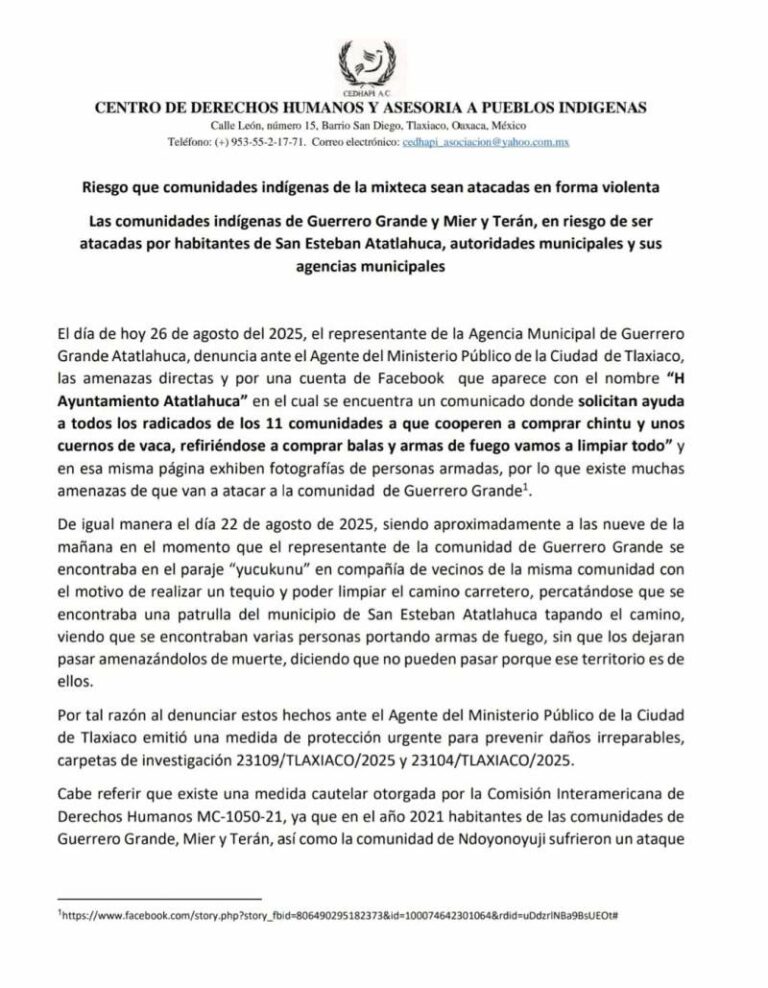 Advierten nuevo derramamiento de sangre por conflicto entre Guerrero Grande y San Esteban Atatlahuca Habitantes de las comunidades de Guerrero Grande y Miér y Terán en la región de la mixteca en la región… 26 agosto, 2025