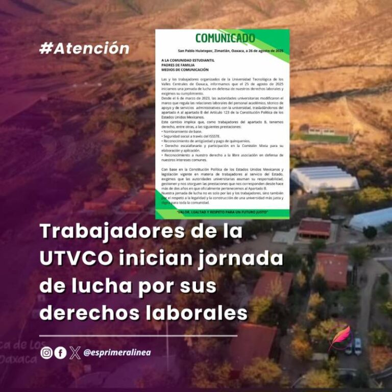 Trabajadores de la UTVCO inician jornada de lucha por sus derechos laborales La protesta, respaldada por personal académico y administrativo, busca que las autoridades universitarias otorguen las prestaciones que les corresponden desde… 26 agosto, 2025